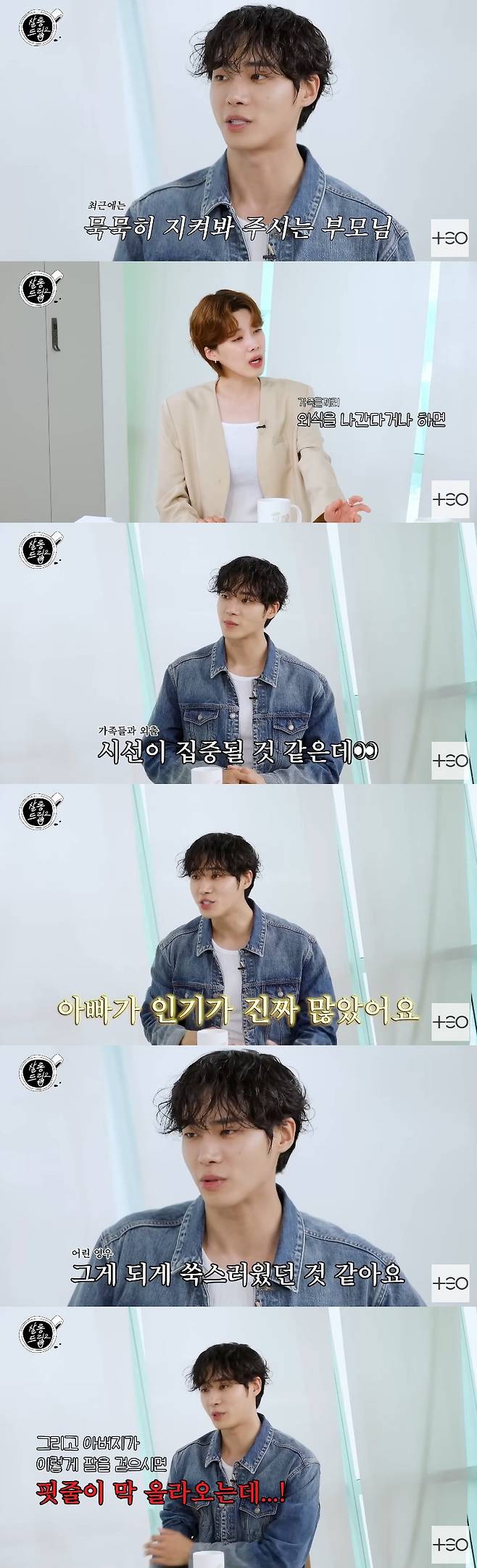 이에 추영우는 "어렸을 때 아빠 손잡고 다닐 때 인기가 진짜 많으셨다. 어딜 가든"이라며 "그게 되게 쑥스러웠던 것 같다. 그리고 아버지가 이렇게 팔을 걷으시면 핏줄이 막 올라오는데 그게 어린 나이에 창피했던 것 같다"라고 어린 시절 아버지의 인기에 난감했던 심정을 웃으며 고백했다.