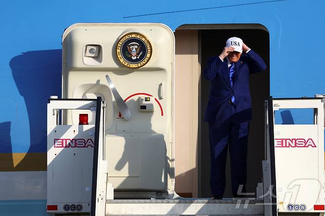 (암스테르담 로이터=뉴스1) 류정민 특파원 = 도널드 트럼프 미국 대통령이 24일(현지시간) 네덜란드 암스테르담 스히폴 공항에 도착한 에어포스원(미 대통령 전용기)에서 내리면서 모자를 쓰고 있다. 트럼프 대통령은 24~25일 헤이그에서 열리는 북대서양조약기구(NATO, 나토) 정상 회의에 참석한다. 2025.06.24