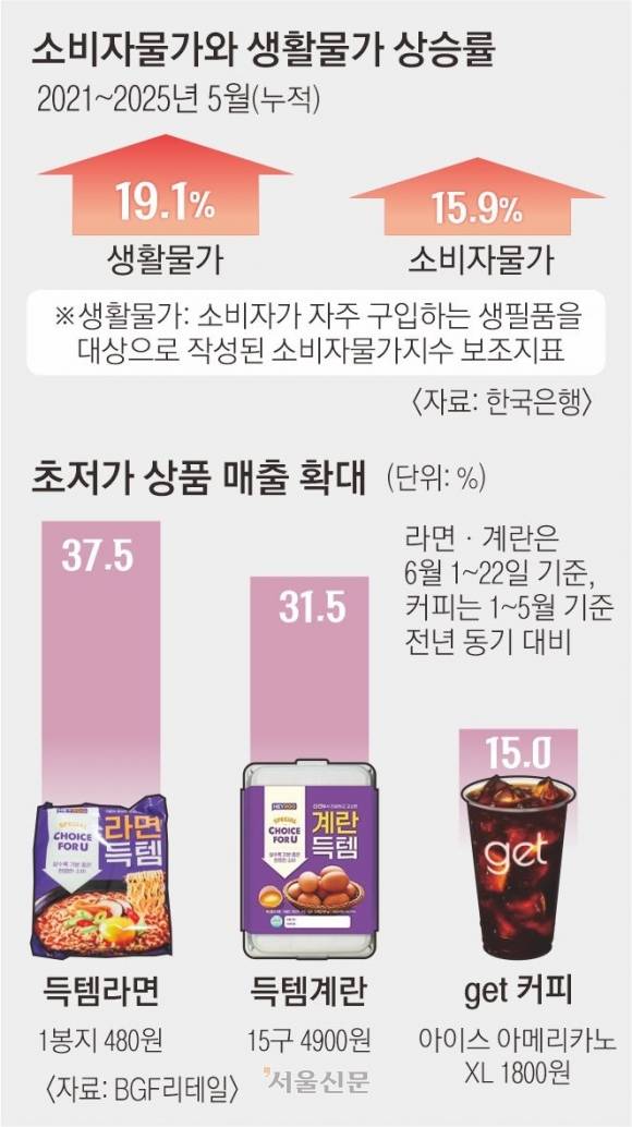 유통업계는 가격 경쟁력 확보에 집중하고 있다. 최근 커피 전문점들이 원두값 인상 등을 이유로 가격을 올린 가운데 CU는 자체 커피 브랜드 ‘겟커피’ 가격을 유지하면서 올해 1~5월 매출이 전년 동기 대비 15% 올랐다. 유통사가 미리 판매 가격을 정해놓고 이윤을 맞추는 ‘가격 역설계’ 제품도 늘어나는 모습이다. 이랜드 킴스클럽은 25일부터 계란 1판(30구)을 6990원에 전국 6000판 한정 판매하기로 했다. 산란 농장과 직거래를 통해 유통 단계를 줄이고 가격 경쟁력을 확보했다는 설명이다. 롯데마트는 26일부터 15년 전 가격인 5000원에 치킨 한 마리를 판매하는 ‘통큰치킨’ 세일을 6년 만에 진행한다.