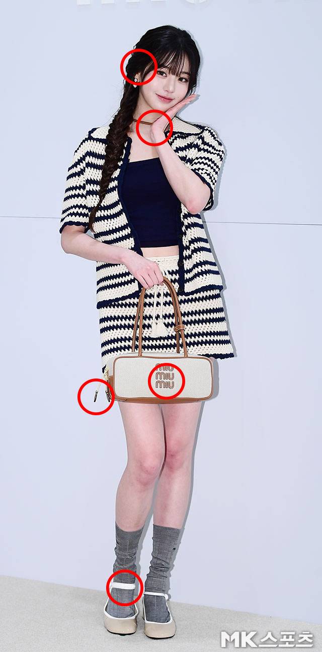 이날 행사에서 장원영은 네이비 스트라이프 니트 셋업에 크롭탑, 그리고 아이보리 메리제인 슈즈를 매치해 날씬한 몸매와 빼어난 미모를 뽐냈습니다.
