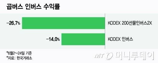 25일 한국거래소에 따르면 이달 들어(6월2일~23일까지) 개인 투자자 순매수 상위 종목(개별 종목 및 ETF 상품 포함) 2위에 KODEX 200선물인버스2X(3790억원) ETF(상장지수펀드)가 이름을 올렸다. 같은 기간 KODEX 인버스 ETF 상품은 개인 투자자들의 순매수 상위 종목 10위(1104억원)에 등극했다.