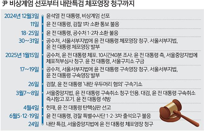 조은석 특별검사팀이 24일 윤석열 전 대통령에 대한 체포영장을 전격적으로 청구한 데는 윤 전 대통령이 수사에 줄곧 불응해온 점이 주요하게 고려됐다. 특검은 수사 초기 단계에 윤 전 대통령 신병을 확보해 원활한 수사를 이어나간다는 방침이다.