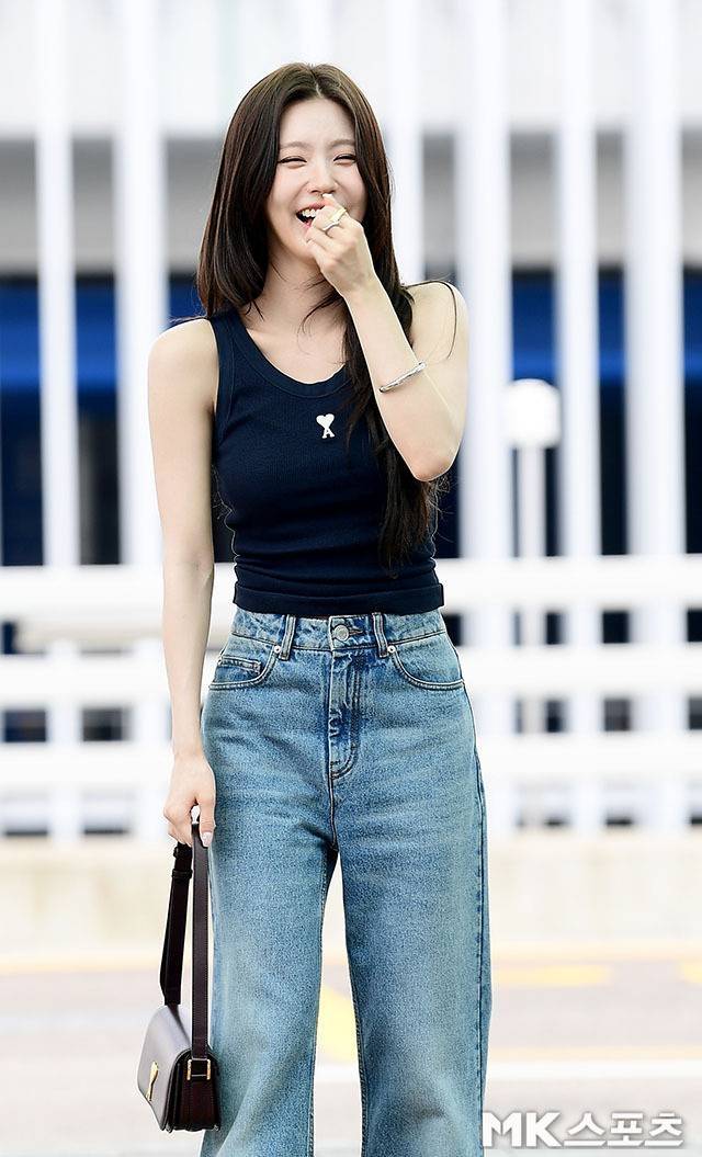 이날 그는 네이비 민소매 톱과 롱 데님 팬츠를 매치해 단정하면서도 세련된 공항 패션을 선보였다.