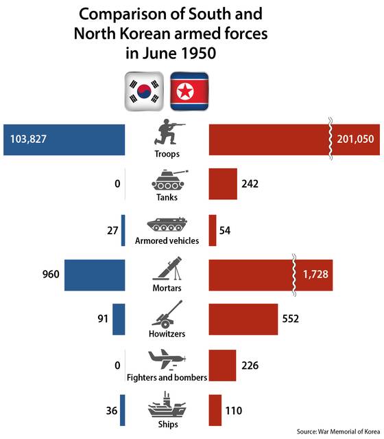 By June 1950, North Korea’s army had grown to almost 200,000 men. In contrast, South Korean forces — lightly armed and lacking tanks or combat aircraft — numbered only around 100,000. The Americans, wary that Rhee might launch an invasion of his own, had refused to supply South Korea with heavy weapons.