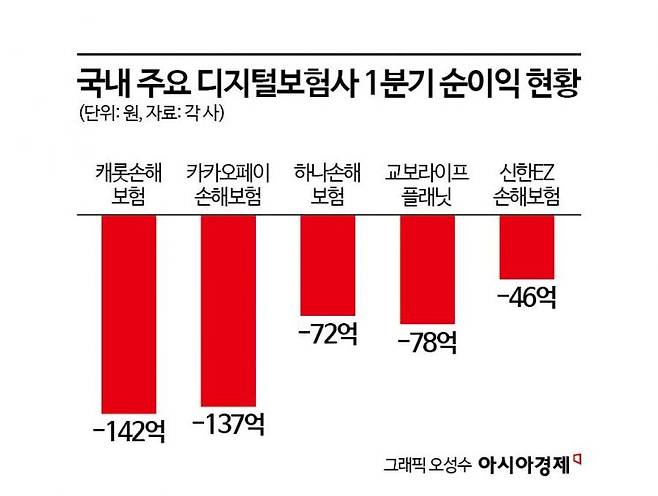25일 금융권에 따르면 올해 1분기 국내 주요 디지털보험사 5곳(캐롯손해보험·카카오페이손해보험·하나손해보험·교보라이프플래닛·신한EZ손해보험)의 당기순손실은 475억원으로 전년 동기(-345억원)와 비교해 적자 폭이 확대됐다. 이들 보험사 중 하나손보를 제외하고 아직까지 연간 흑자를 기록한 곳은 없다. 하나손보가 기록한 2021년 170억원 흑자도 사옥 매각 이익에 따른 것으로 디지털보험사의 적자는 어제오늘 일이 아니다.