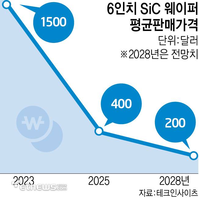 시장조사업체 테크인사이츠 등에 따르면 6인치 SiC 웨이퍼 평균판매가격(ASP)은 최근 400달러 이하로 떨어졌다. 2023년만 하더라도 1500달러 수준이던 가격이 약 2년 만에 3분의 1 이하로 급락한 것이다.