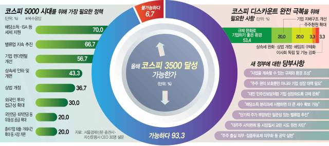 설문에 참여한 CEO 중 한 명은 국내 증시 활성화를 단순 자본시장 정책으로만 한정할 것이 아니라 새 정부 내내 핵심 경제정책으로 실행할 필요가 있다고 당부했다. 그는 “증시 수익률을 높이면 국민연금 고갈 시기가 지연되고 노인 복지 관련 재정 부담이 완화되면서 젊은 세대의 부담을 줄여줄 수 있다”며 “코리아 디스카운트 해소는 재정·조세 등 거시경제 전반에 중요한 영향을 미칠 수 있는 정책”이라고 밝혔다.