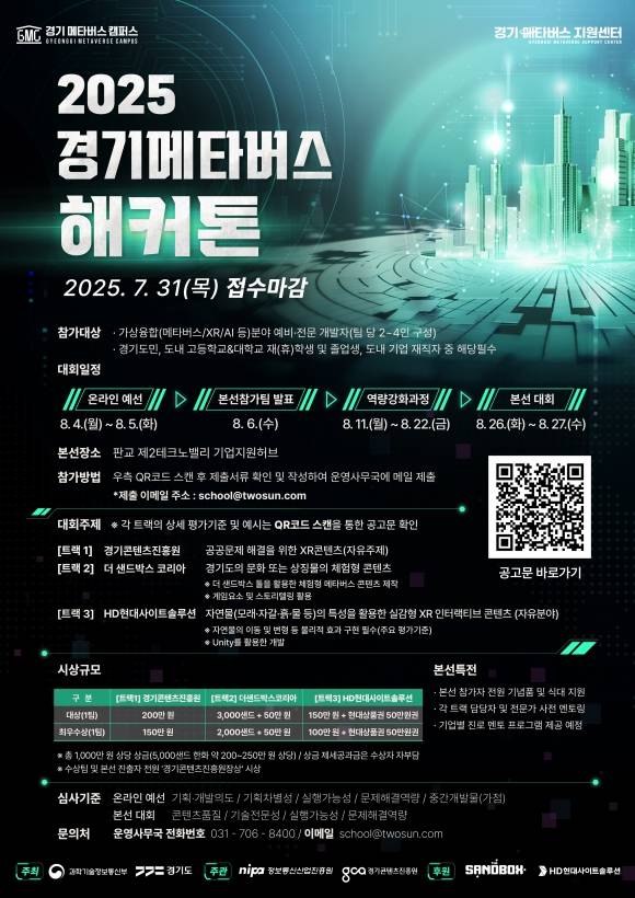 과학기술정보통신부와 경기도가 주최하고 정보통신산업진흥원과 경기콘텐츠진흥원이 주관하는 '2025 경기 메타버스 해커톤'은 메타버스, XR, AI 등 가상 융합 산업 기술에 기반한 공공 문제 해결과 글로벌 기업 과제에 도전하는 개발 경진대회다.