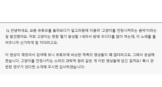 지금까지의 이야기를 종합해서 사연자님이 반려묘에게 들려준 음악을 분석해 보죠. 이 음악은 잔잔한 클래식 음악과 더불어 고양이의 골골송이 더해져 앞서 설명한 연구 결과처럼 사람에게도 듣기 편하고, 고양이에게도 진정시키는 데 도움이 될 수 있는 구성 요소를 갖춘 것으로 보입니다. 어쩌면 이 영상을 만든 분은 위의 연구 결과들을 참고해 유튜브에 올렸을지도 모르겠네요.
