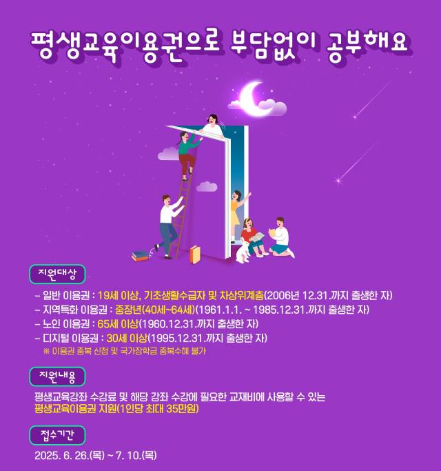신청 기한은 오는 6월 26일부터 7월 10일까지이며 평생교육이용권 누리집을 통해 접수한다. 울산시는 7월 중 1240여 명을 최종 선정해 1인당 35만 원 상당의 평생교육이용권을 지급할 예정이다.
