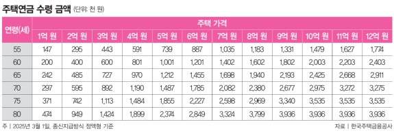 예를 들어 주택 가격이 3억 원, 가입 연령이 55세라면 매달 44만3000원을 받지만 70세라면 89만2000원을 받을 수 있다(표 참조). 만약 70세 가입자가 보유한 주택 가격이 10억 원이면 매달 297만5000원을 받게 된다. 주택 가격이 비싸고 나이가 많을수록 금액이 높아지는 구조다.물론 주택연금 가입을 검토할 때는 미리 알아야 할 점도 있다. 먼저 연금 가입 이후 주택 공시가격이 상승해도 월 지급액이 늘어나지 않는다. 주택연금 중도 해지 시에는 지금까지 받은 연금 지급액(월 수령액, 개별 인출금)과 보증료(초기 보증료, 연 보증료), 대출이자를 한꺼번에 상환해야 하고, 해지 후 3년간 동일 주택으로는 연금 재가입이 제한된다. 또 주택 공시가격이 12억 원 이하여야 해 사전 확인이 필요하다. 공시가격은 '부동산공시가격 알리미' 사이트와 '한국부동산원 부동산정보' 애플리케이션에서 조회할 수 있다. 공시가격이 12억 원을 넘을 때는 은행 등에서 취급하는 주택연금 상품을 활용하면 된다.