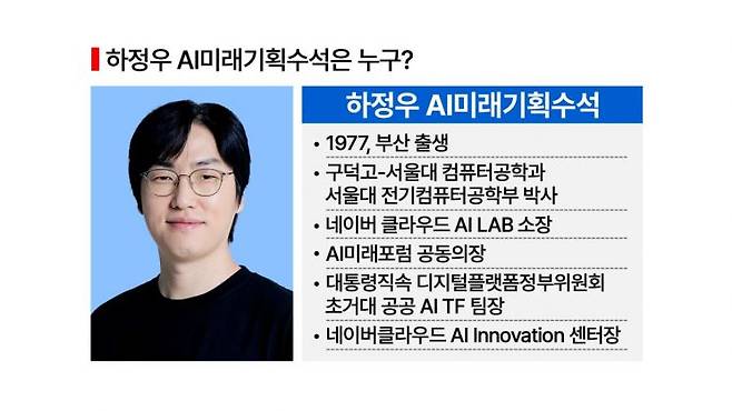 하 수석은 1977년 부산에서 태어났다. 부산 구덕고등학교를 졸업하고 서울대 컴퓨터공학과에서 학사·석사·박사를 마쳤다. 네이버 클라우드 AI 랩 소장, AI 미래포럼 공동의장, 대통령 직속 디지털 플랫폼 정부위원회 초거대 공공AI 팀장을 지냈다. 네이버 퓨처 AI 센터장·네이버 클라우드 AI 이노베이션 센터장으로 있다가 이재명 정부 대통령실 AI 미래기획 수석을 맡았다. 그는 네이버의 AI 기술을 전반적으로 총괄했던 딥러닝 전문가다.