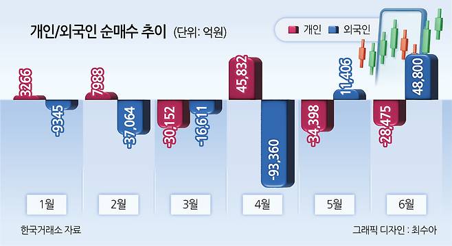 외국인 투자자와는 정반대의 행보다. 외국인은 1~4월까지 각각 9345억원, 3조7064억원, 1조6611억원, 9조3360억원을 순매도하다 5~6월은 각각 1조 1406억원, 4조8800억원을 순매수했다.