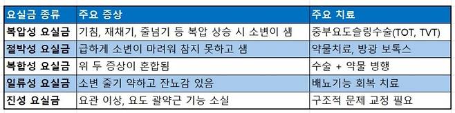 반면, 절박성 요실금은 약물 치료가 기본이다. 경우에 따라선 방광 내 보톡스 주사가 필요할 때도 있다. 그에 비해 일류성 요실금, 진성 요실금은 배뇨기능과 구조적 문제를 먼저 해결해야 한다.