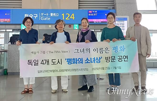 | ▲ 6월 27~31일 사이 독일 4개 도시 평화의소녀상 방문 공연 활동에 나서는 일본군위안부할머니함께하는 마창진시민모임 정갑숙 사무국장, 이경희 대표와 장순향, 배달래, 한대수 예술가(왼쪽부터)가 출국 전 25일 인천국제공항 탑승구 앞에 모였다. |