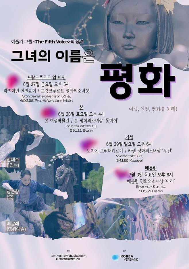 '그녀의 이름은 평화' 공연은 27일 오후 5시 프랑크푸르트 암 마인 라인마인한인교회 평화의소녀상, 28일 오후 4시 본 여성박물관 평화의소녀상 '동마이', 29일 오후 6시 카셀 노이에 브뤼더키르혜 평화의소녀상 '누진', 7월 3일 오후 6시 베를린 평화의소녀상 '아리' 앞에서 열린다.