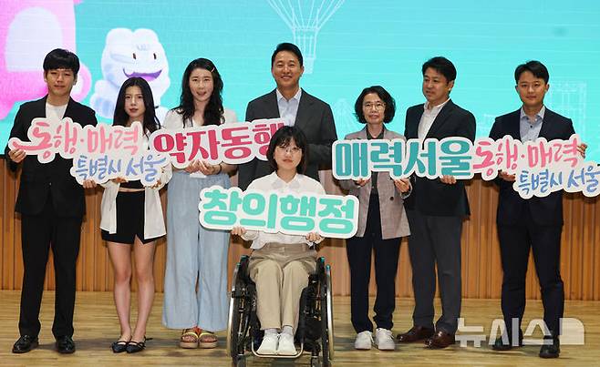[서울=뉴시스] 권창회 기자 = 오세훈 서울시장이 25일 오전 서울 중구 서울시청에서 열린 약자동행 매력서울 창의 발표회에서 참석자들과 기념촬영을 하고 있다. 2025.06.25. kch0523@newsis.com