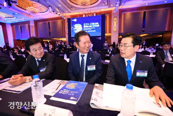 더불어민주당 당 대표에 출마한 박찬대 의원(오른쪽)과 정청래 의원(가운데), 정동영 통일부 장관 내정자가 25일 서울 중구 롯데호텔에서 열린 <2025 경향포럼>에 참석해 대화하고 있다.