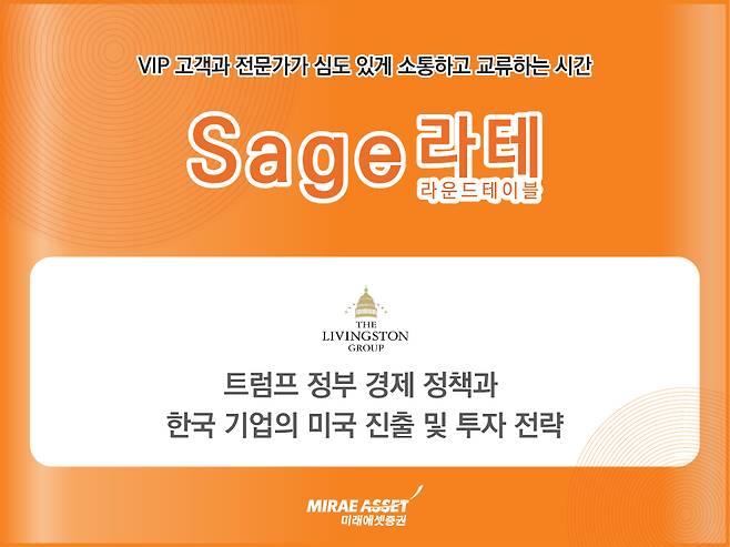 'Sage 라운드테이블'은 미래에셋증권의 VIP 프라이빗 세미나 시리즈로 각 분야 전문가와 고객이 깊이 있는 대화를 자리다.