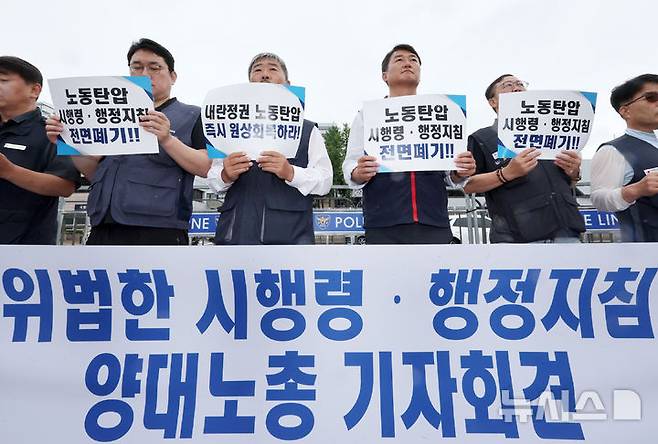 [서울=뉴시스] 조성우 기자 = 양경수(오른쪽 세 번째부터) 민주노총 위원장과 김동명 한국노총 위원장 등 양대노총 산하 위원장들이 25일 오전 서울 용산구 대통령실 인근에서 '노동을 짓밟은 위법한 시행령·행정지침 원상회복 요구' 기자회견을 하고 있다. 2025.06.25. xconfind@newsis.com