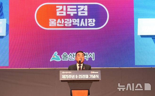 [울산=뉴시스] 배병수 기자 = 김두겸 울산시장이 25일 울산시청 2층 대강당에서 열린 6·25전쟁 제75주년 추념식에서 기념사를 하고 있다. 2025.06.25.bbs@newsis.com.