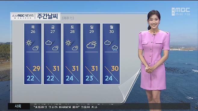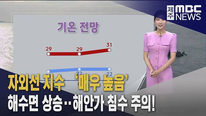 낮 최고 기온은 북부 29도, 서부 25도, 남부 26도, 산지 성판악 24도로 예상됩니다.