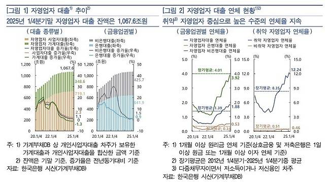 자영업자의 경우 상황이 더 나빴습니다. 1분기 말 기준 자영업자 대출 잔액은 1067조6000억원으로, 전년 동기 대비 1.1% 증가했습니다.