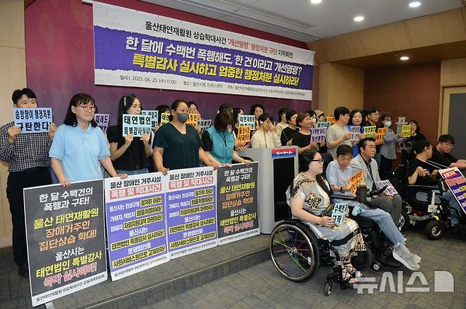[울산=뉴시스] 배병수 기자 = 울산 태연재활원 상습학대사건 공동대책위원회는 25일 오전 울산시청 프레스센터에서 태연재활원 상습학대사건 ‘개선명령’ 행정처분 규탄 기자회견을 열고 있다. 2025.06.25.bbs@newsis.com.