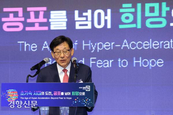 김석종 경향신문 사장이 25일 서울 중구 롯데호텔 크리스탈볼룸에서 '초가속 시대의 도전, 공포를 넘어 희망으로'를 주제로 열린 <2025 경향포럼>에서 개막사를 하고 있다.