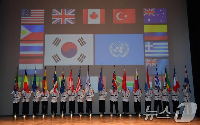 (포항=뉴스1) 최창호 기자 = 25일 경북 포항시청 대잠홀에서 열린 6.25전쟁 75주년 기념식에서 UN과 참전 국가들의 국기가 입장하고 있다. 2025.6.25/뉴스1