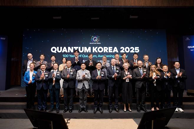 | ▲ 유상임 과학기술정보통신부 장관이 24일 오후 서울 서초구 aT센터에서 열린 '퀀텀 코리아 2025 개막식' 에서 주요참석자들과 기념촬영을 하고 있다. |