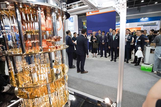 | ▲ 유상임 과학기술정보통신부 장관이 24일 오후 서울 서초구 aT센터에서 열린 '퀀텀 코리아 2025 개막식' 에 참석해 한국IBM전시관에서 양자컴퓨팅 및 초전도 관련 설명을 듣고 있다. |