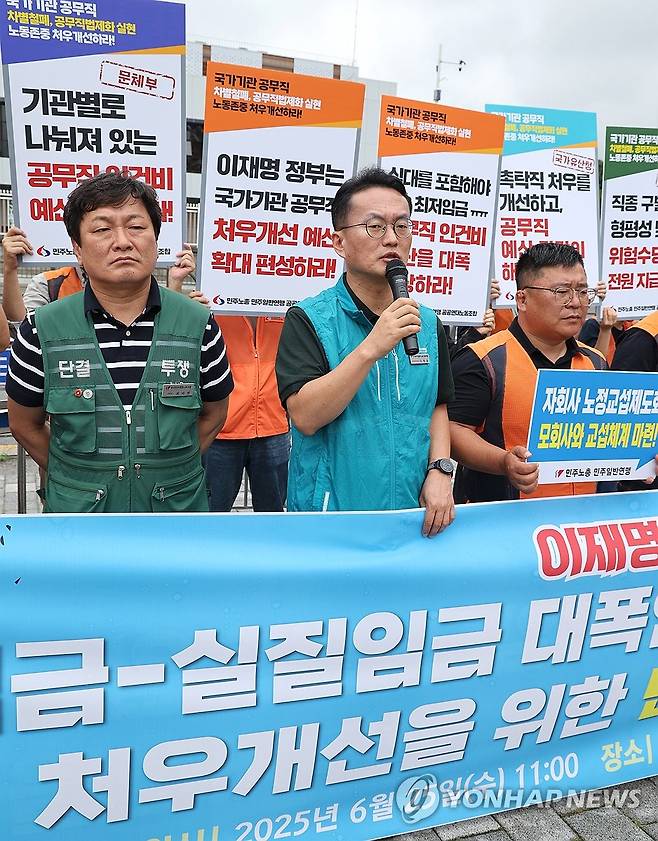 (서울=연합뉴스) 서명곤 기자 = 25일 서울 용산구 대통령실 앞에서 민주일반연맹이 연 기자회견에서 이영훈 비대위원장이 최저임금·실질임금 대폭인상과 비정규직노동자 차별철폐 등을 요구하는 발언을 하고 있다. 2025.6.25