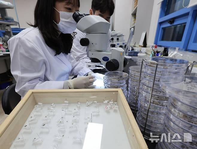 [인천=뉴시스] 전진환 기자 = 전국에 말라리아 주의보가 내려진 가운데 25일 오전 인천 중구 인천보건환경연구원 매개체감염병과 실험실에서 연구사들이 모기 종 분류작업을 하고 있다.