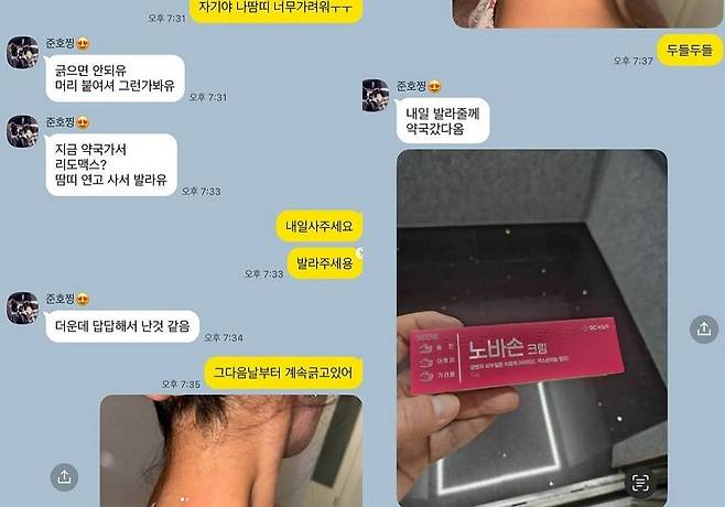이에 김지민은 “내일 사주세요. 발라주세용”이라며 “그 다음날부터 계속 긁고 있어”라고 귀엽게 응수했고, 김준호는 “내일 발라줄게. 약국갔다옴”이라며 김지민 대신 연고를 미리 사두는 세심한 배려로 시선을 모았다.