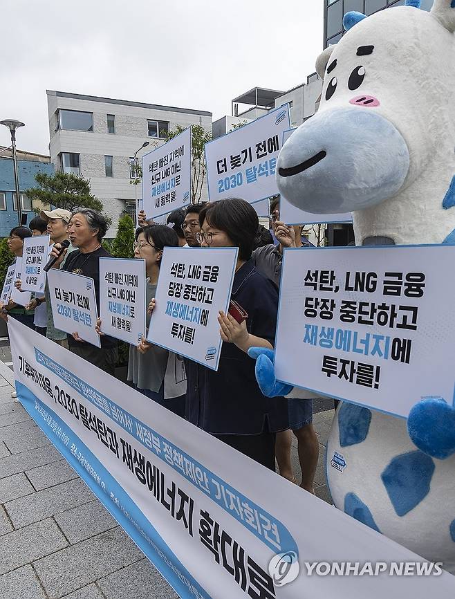 (서울=연합뉴스) 황광모 기자 = 25일 서울 종로구 국정기획위원회가 입주한 정부서울청사 창성동 별관 앞에서 삼척 석탄화력발전소 반대 투쟁위와 화석연료를 넘어서 회원들이 이재명 정부의 '2030 탈석탄 선언'과 '재생에너지 확대'를 촉구하는 기자회견을 열고 있다. 2025.6.25