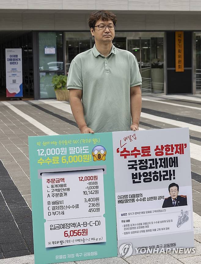 (서울=연합뉴스) 황광모 기자 = 25일 서울 종로구 국정기획위원회가 입주한 정부서울청사 창성동 별관 앞에서 온플법 제정 촉구 공동행동 관계자들이 배달앱 총수수료 상한제 국정과제 반영을 촉구하며 1인 시위를 벌이고 있다. 2025.6.25