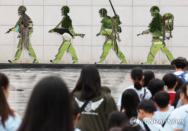 (오산=연합뉴스) 홍기원 기자 = 6·25 전쟁 75주년인 25일 경기도 오산시 죽미령평화공원을 찾은 학생들이 유엔 스미스 특수임무부대의 행군 모습이 새겨진 조형물을 살펴보고 있다. 2025.6.25