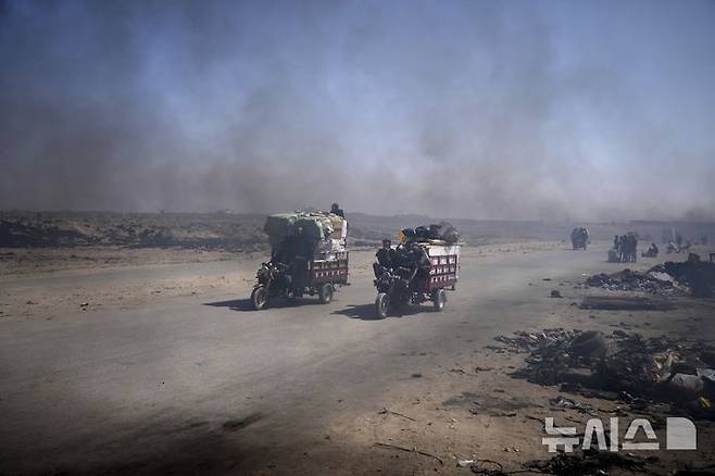 지난 22일(현지 시간) 가자지구 가자시티 남쪽 시로드에서 팔레스타인 주민들이 플라스틱을 녹여 연료를 추출하는 임시 버너에서 뿜어져 나오는 검은 연기 속을 지나가고 있다.