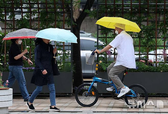 [서울=뉴시스] 이영환 기자 = 장마전선 영향으로 비가 내린 25일 오후 서울 중구 서울시청 인근에서 시민들이 우산을 쓰고 이동하고 있다. 2025.06.25. 20hwan@newsis.com