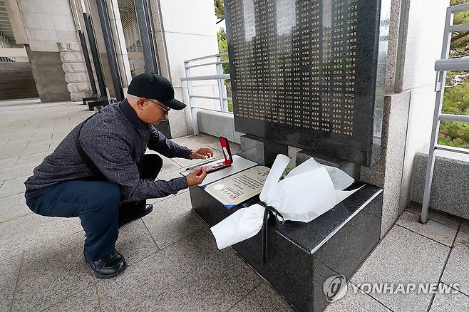 (서울=연합뉴스) 신현우 기자 = 6·25전쟁 75주년인 25일 서울 용산구 전쟁기념관을 찾은 어르신이 6·25전쟁 참전용사인 막내 삼촌 명비 앞에 헌화한 뒤 무공훈장을 올려두고 있다. 2025.6.25