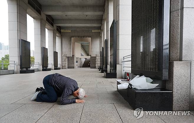 (서울=연합뉴스) 신현우 기자 = 6·25전쟁 75주년인 25일 서울 용산구 전쟁기념관을 찾은 어르신이 6·25전쟁 참전용사인 막내 삼촌 명비 앞에서 절하고 있다. 2025.6.25