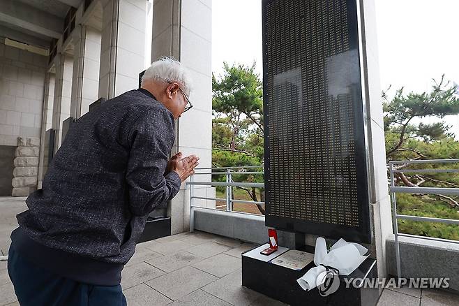 (서울=연합뉴스) 신현우 기자 = 6·25전쟁 75주년인 25일 서울 용산구 전쟁기념관을 찾은 어르신이 6·25전쟁 참전용사인 막내 삼촌 명비 앞에서 절하고 있다. 2025.6.25