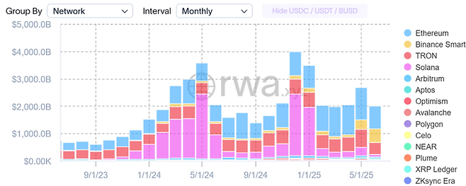 올해들어 사용량이 크게 늘어난 건 바이낸스체인으로 지난해 12월엔 1212억달러 수준이었는데 이달들어 5074억달러 수준으로 크게 증가했다.