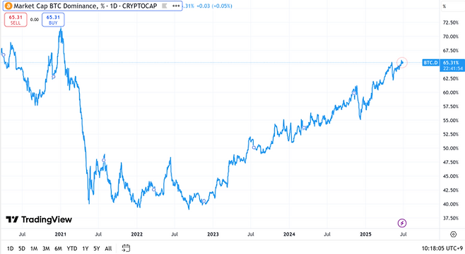현재 비트코인 도미넌스는 65.31%로 지난 2021년 1월 이후 최고 수준이다.