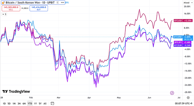 따라서 달러 기준으로 봤을때의 비트코인 상승률에 비해 원화 기준 비트코인 상승률이 낮게 나타난 것이다.