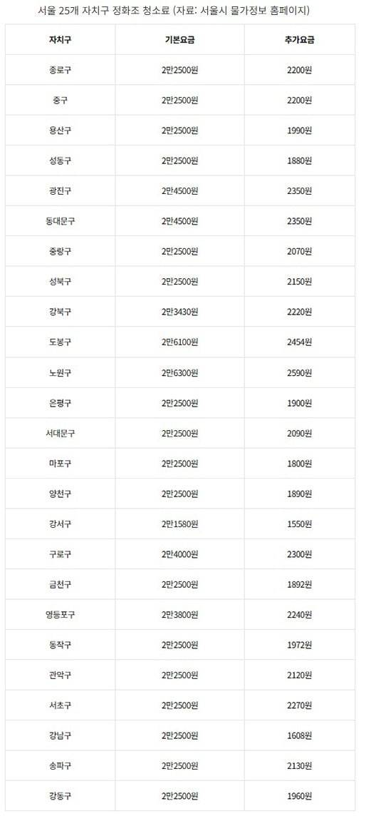 25일 서울시는 물가정보 홈페이지에 이날 기준 자치구별 정화조 청소료 현황을 등록했다. 청소비와 더불어 부과되는 정화조 청소료 기본요금은 25개 자치구에 따라 2만1580~2만6300원, 초과요금은 1550~2590원까지 다양한 것으로 확인됐다.
