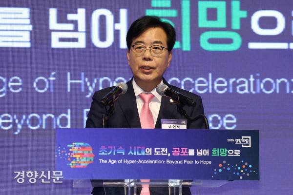 송언석 국민의힘 원내대표가 25일 서울 중구 롯데호텔 크리스탈볼룸에서 '초가속 시대의 도전, 공포를 넘어 희망으로'를 주제로 열린 <2025 경향포럼>에서 축사를 하고 있다.