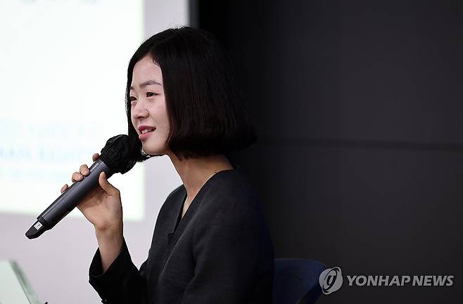 (서울=연합뉴스) 윤동진 기자 = 25일 서울글로벌센터에서 열린 '유엔 북한인권서울사무소, 피해자 및 증인이 바라보는 지난 10년 간의 조선민주주의인민공화국 내 인권 상황' 공개세션에서 북한 이탈주민이 발언하고 있다. 2025.6.25