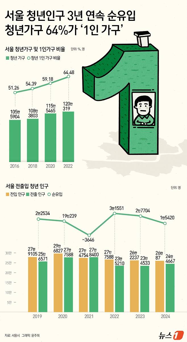 [오늘의 그래픽]서울 청년인구 3년 연속 순유입…청년가구 중 64%가 '1인 가구'
